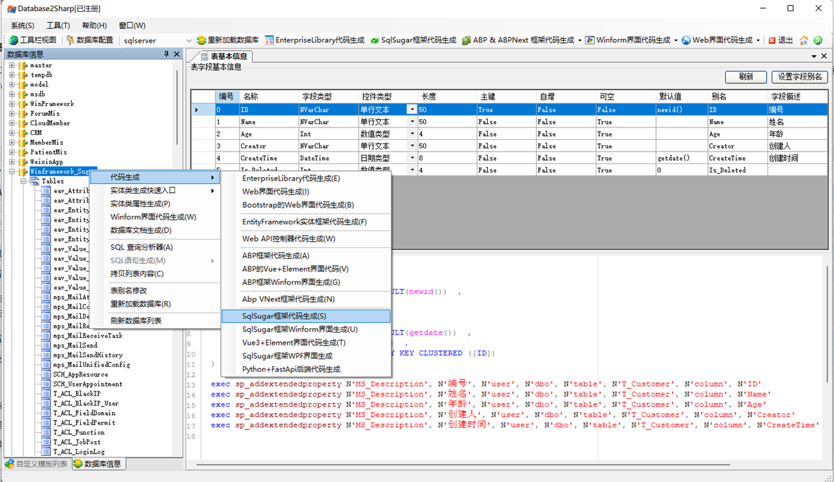 代碼生成工具完美支持Winform開發框架、混合式Winfrom開發框架、Bootstrap開發框架、ABP/ABP -VNext開發框架、SqlSugar開發框架、基于MVC+EasyUI的Web開發框架的整合開發工作;可以生成各種架構代碼、生成Web界面代碼、Vue&Element界面代碼、Winform界面代碼,導出數據庫文檔等功能。